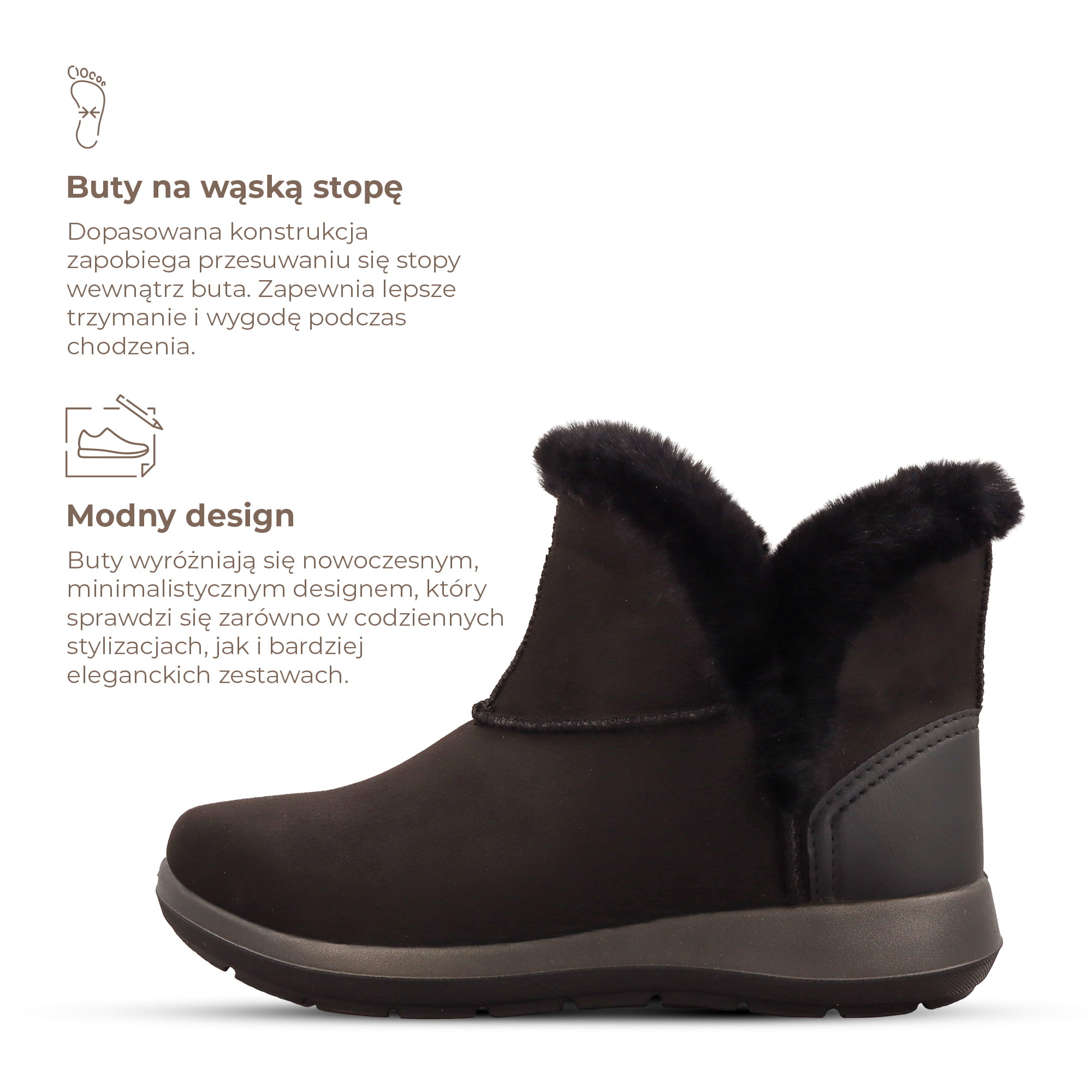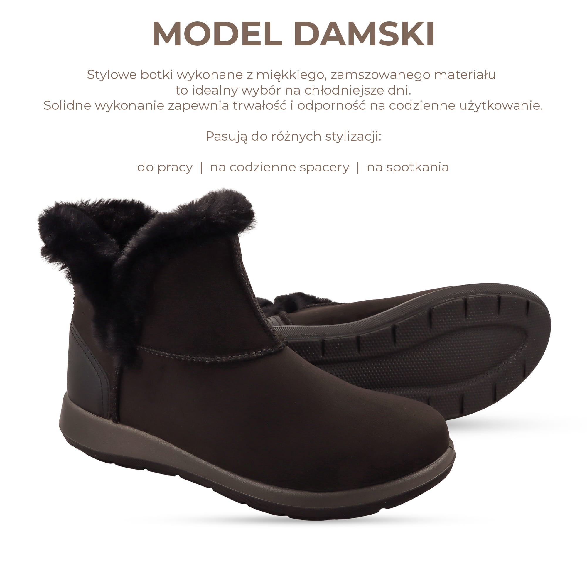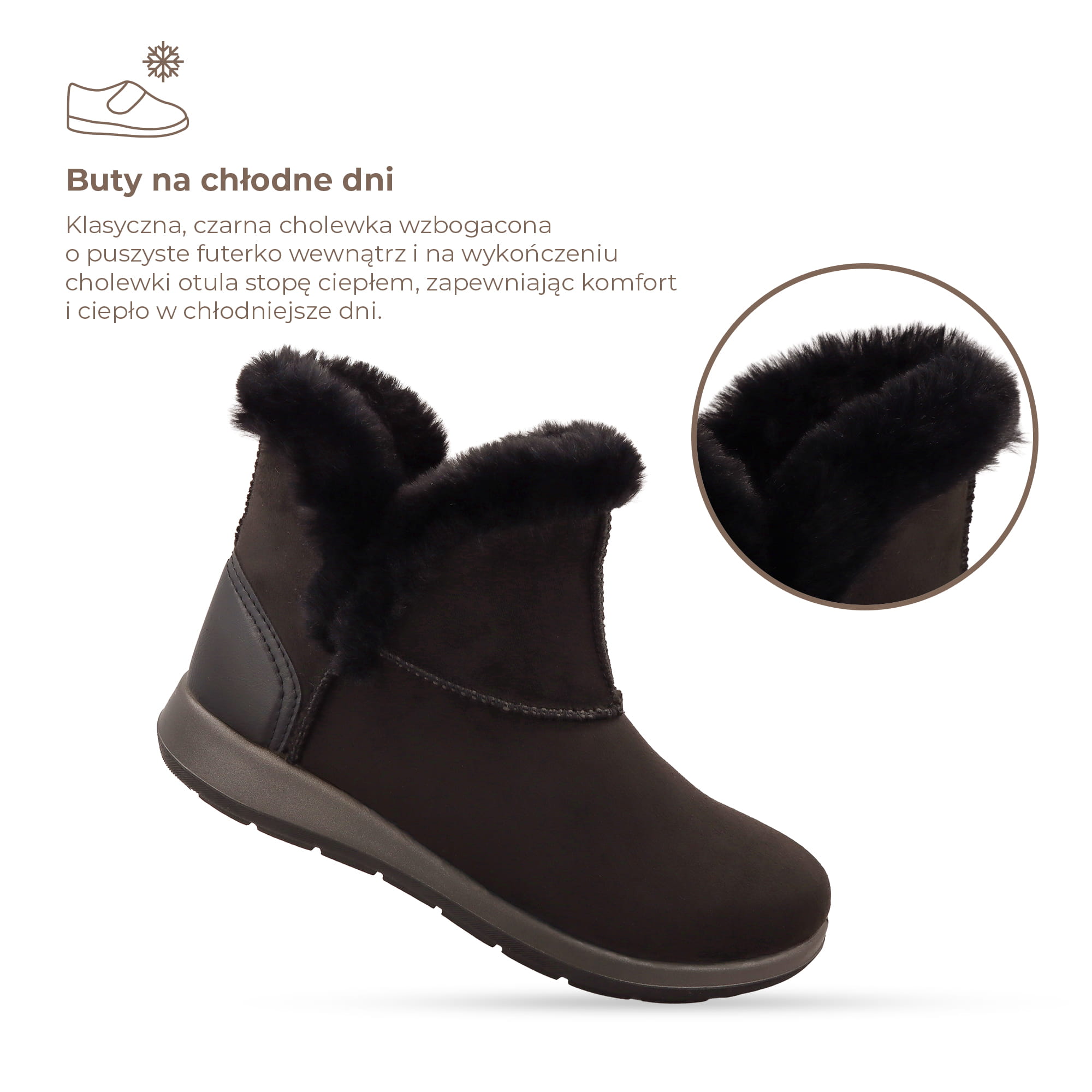 Stylowe botki wykonane z miękkiego, zamszowanego materiału to idealny wybór na chłodniejsze dni. Klasyczna, czarna cholewka wzbogacona o puszyste futerko wewnątrz i na wykończeniu cholewki otula stopę ciepłem, zapewniając komfort nawet w zimowe poranki.