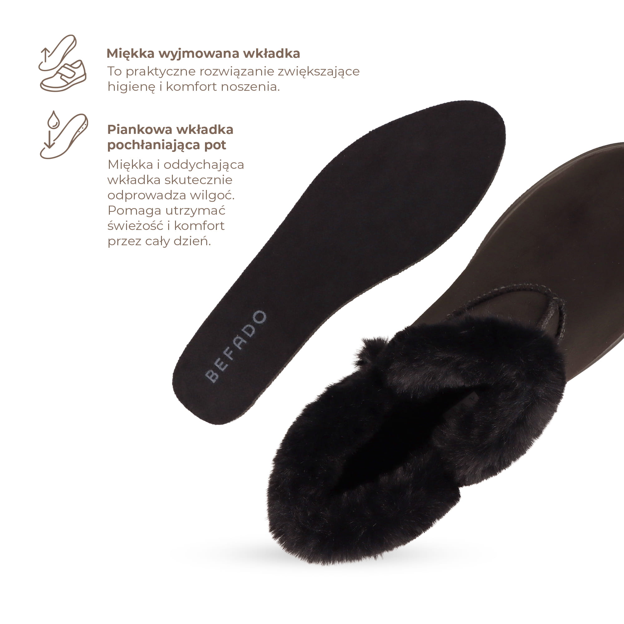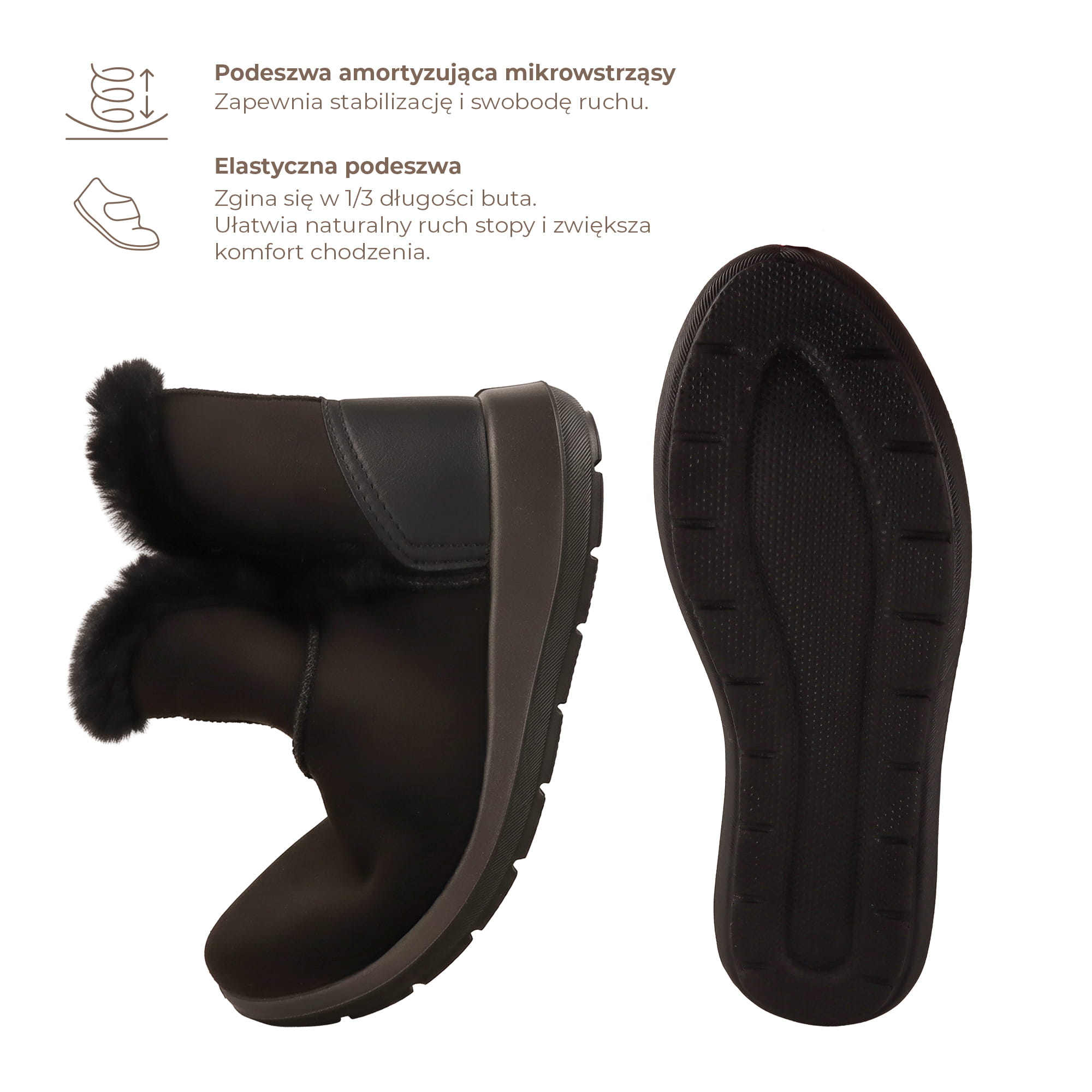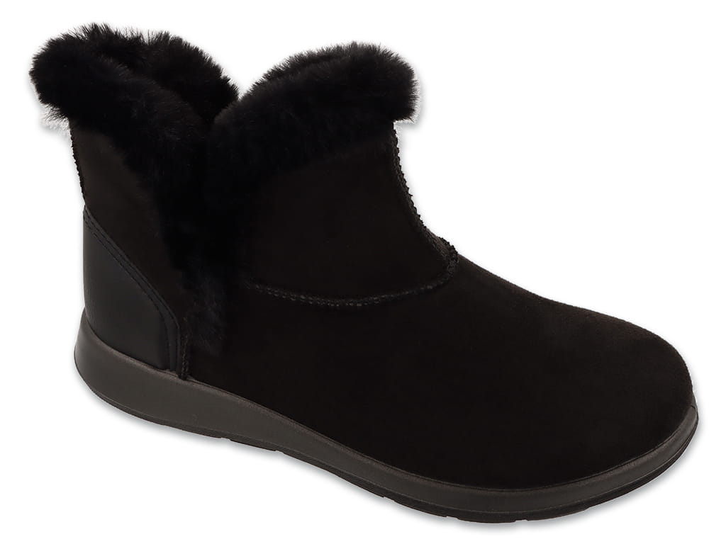 Stylowe botki wykonane z miękkiego, zamszowanego materiału to idealny wybór na chłodniejsze dni. Klasyczna, czarna cholewka wzbogacona o puszyste futerko wewnątrz i na wykończeniu cholewki otula stopę ciepłem, zapewniając komfort nawet w zimowe poranki.