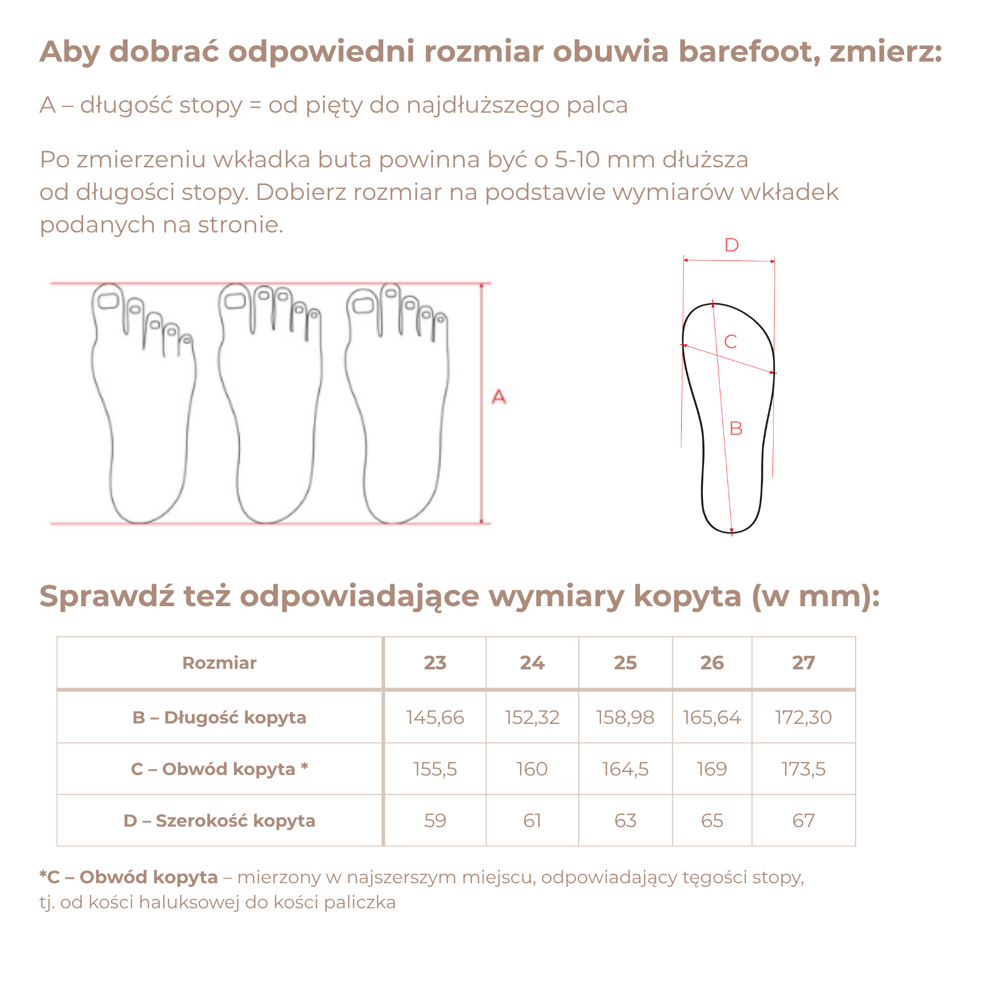 Aby dobrać odpowiedni rozmiar butów barefoot, najpierw zmierz długość stopy dziecka, a następnie dodaj od 0,5 do 1 cm zapasu. Taka przestrzeń zapewni palcom swobodę i pozwoli na naturalne przetaczanie stopy podczas chodzenia.