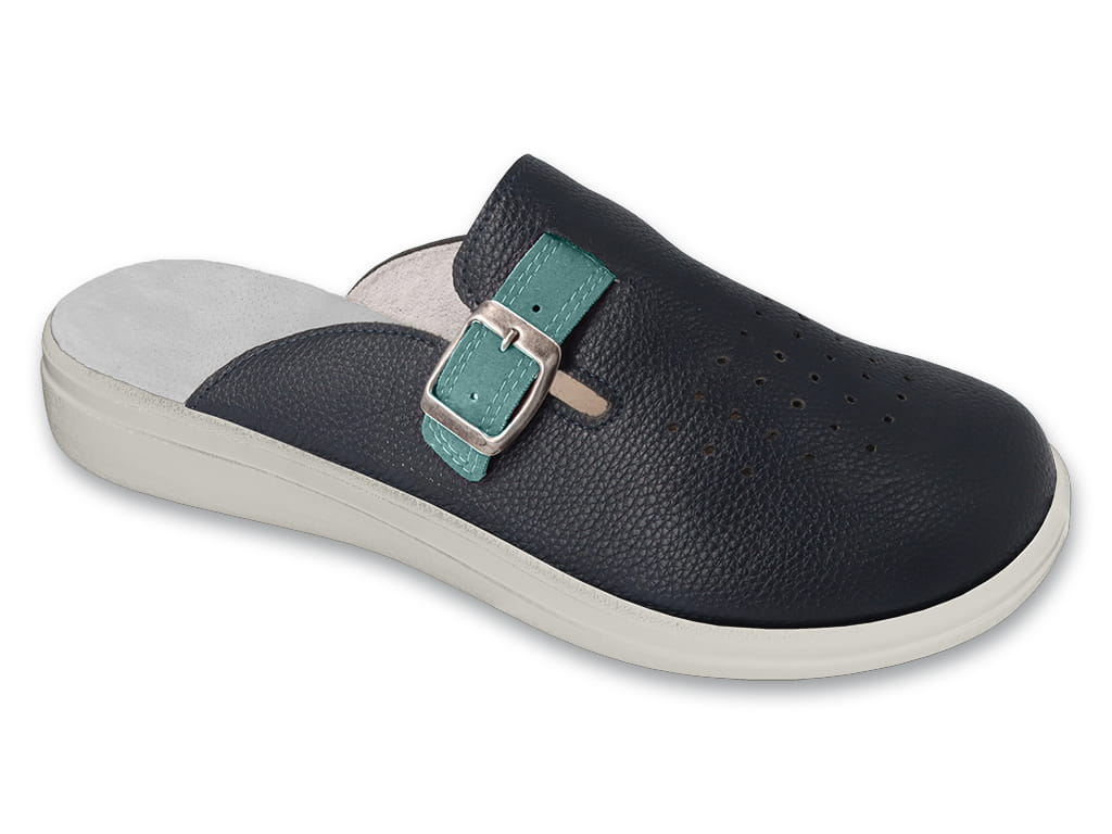 Obuwie wyposażono w stabilną, antypoślizgową podeszwę, która zwiększa bezpieczeństwo poruszania się na różnych nawierzchniach. Zastosowane materiały charakteryzują się wysoką jakością, trwałością oraz odpornością na odkształcenia, co przekłada się na długotrwałe użytkowanie. Wyściółka wykonana z naturalnej skóry sprzyja zachowaniu higieny stóp i komfortu nawet podczas wielogodzinnego noszenia. Możliwość regulacji pozwala na indywidualne dopasowanie klapek do stopy, pomagając ograniczyć ryzyko ucisku i otarć.
