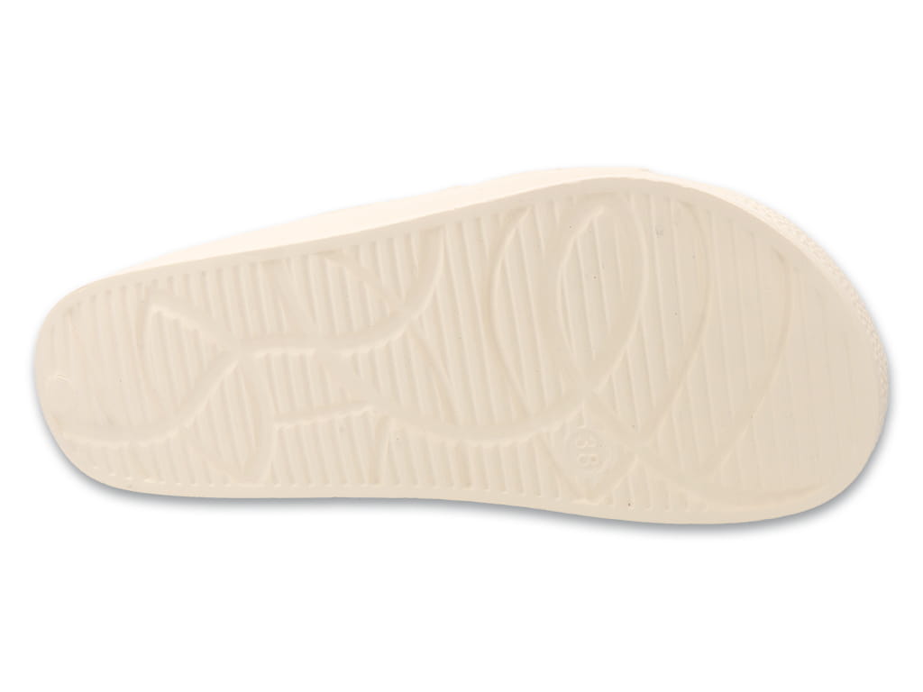 Dwa szerokie paski z klamrami umożliwiają regulację szerokości, dzięki czemu obuwie można dopasować do indywidualnego kształtu stopy. Jasny, beżowy kolor nadaje klapkom uniwersalny charakter i sprawia, że świetnie pasują zarówno do domowego stroju, jak i letnich stylizacji.