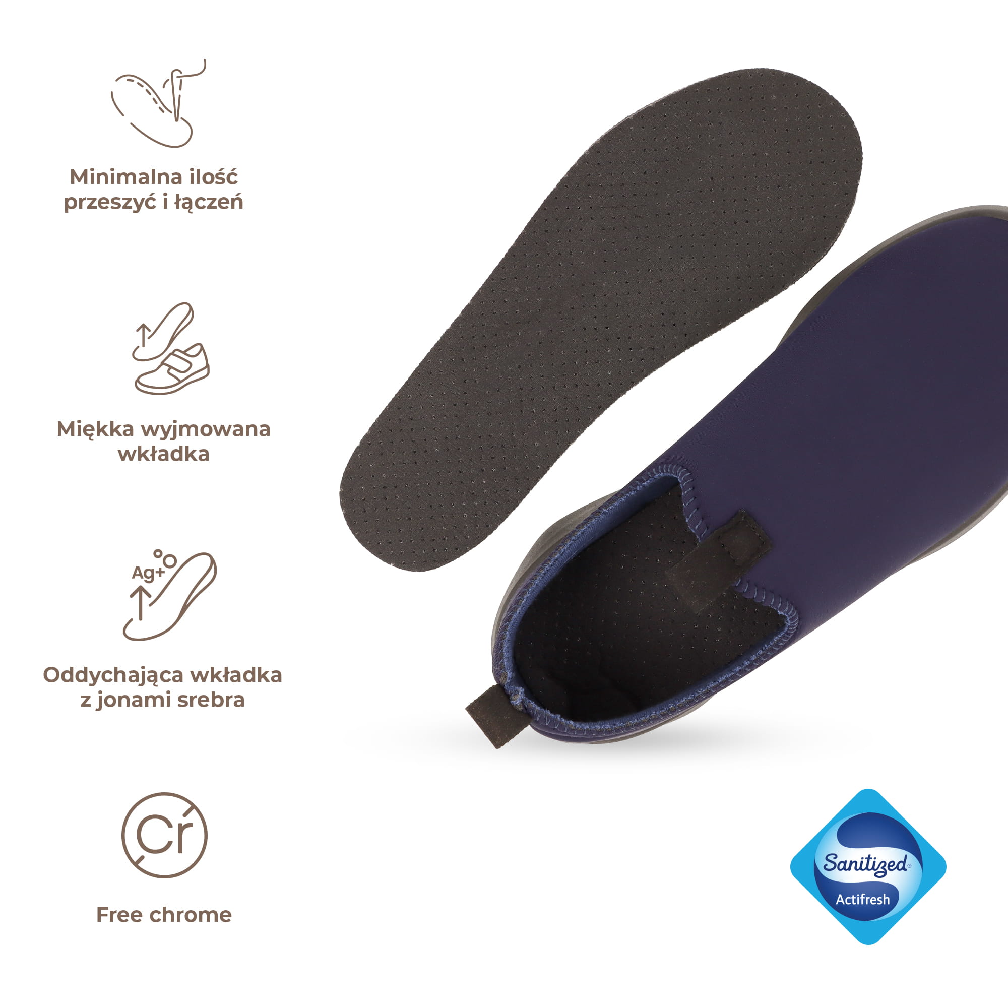Miękka, wyjmowana wkładka pozwala na łatwe utrzymanie higieny i możliwość zastosowania wkładek ortopedycznych.
