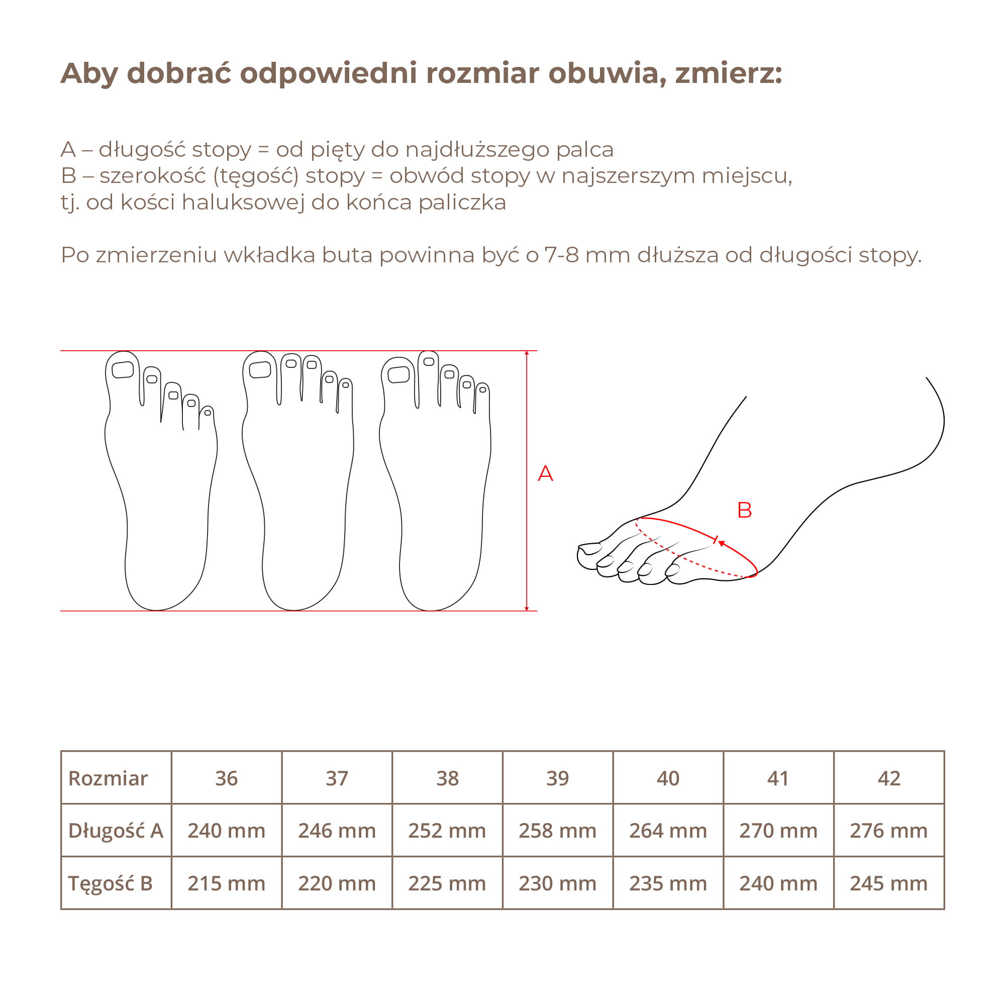 Aby dobrać odpowiedni rozmiar butów, najpierw zmierz długość stopy, a następnie dodaj od 0,5 do 1 cm zapasu. Taka przestrzeń zapewni palcom swobodę i pozwoli na naturalne przetaczanie stopy podczas chodzenia.