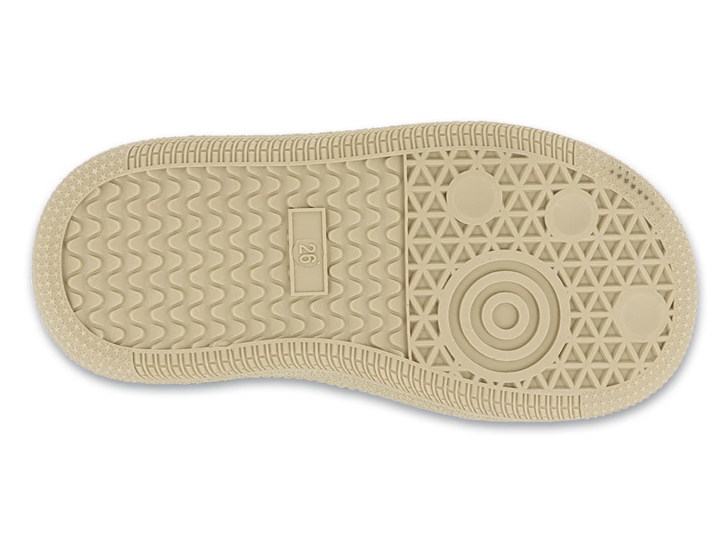 Elastyczna i bezpieczna podeszwa: Beżowa, gumowa podeszwa o właściwościach antypoślizgowych wspiera naturalny ruch stopy i zapewnia stabilność na każdej nawierzchni.