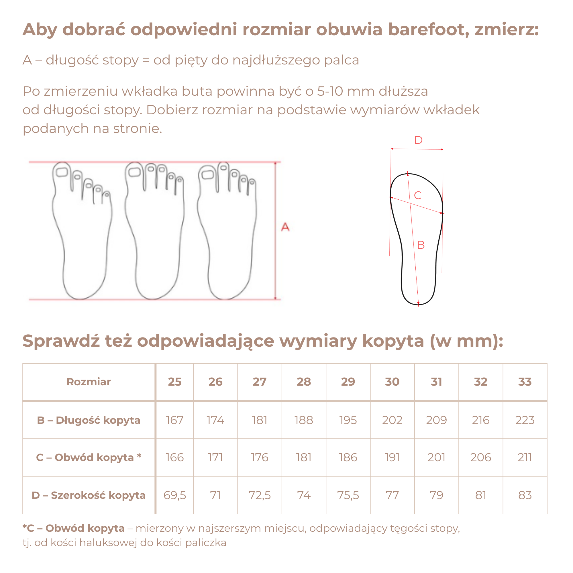 Drogi Rodzicu, pamiętaj, aby zawsze przed zakupem zmierzyć stopę dziecka. Aby buty dawały pełną swobodę przy każdym kroku i podskoku, koniecznie dobierz obuwie o ok. 0,5-1 cm większe niż stopa dziecka. W razie wątpliwości zachęcamy do kontaktu.
